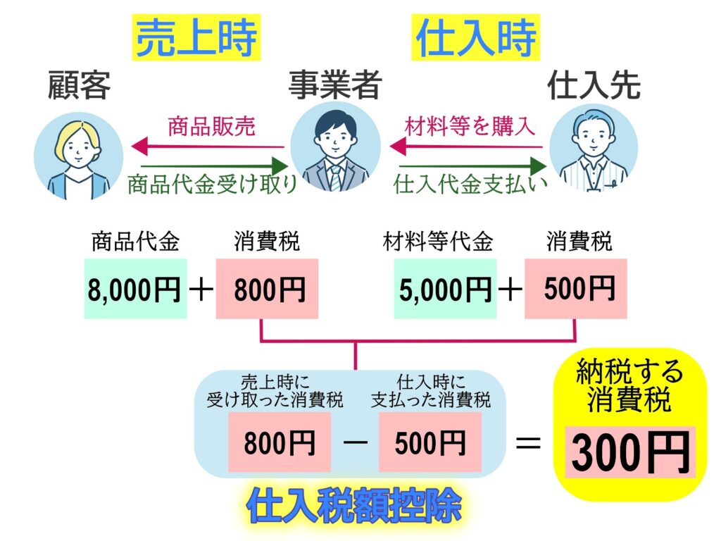 消費税の仕入税額控除は、自社が「売上時に受け取った消費税額」から、自社が「仕入れや経費の支払いの際にかかった消費税額」を差し引いて納税する方法です。