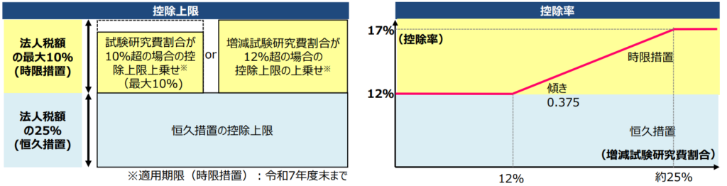 試験研究費割合が10%を超える場合、控除上限額の上乗せ特例の適用期限は3年延長され、令和7年度末までとなりました。