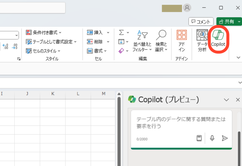 - × ExcelにCopilotのボタンが表示されていればすぐに使える