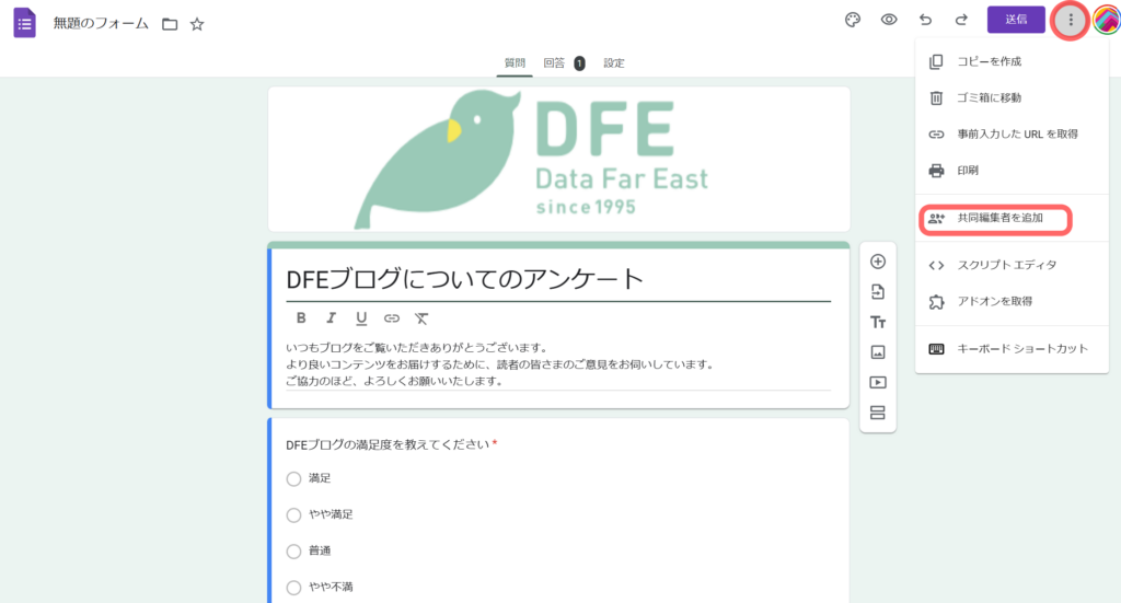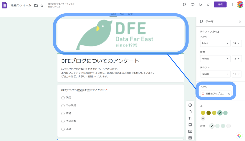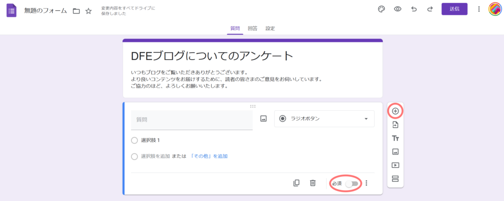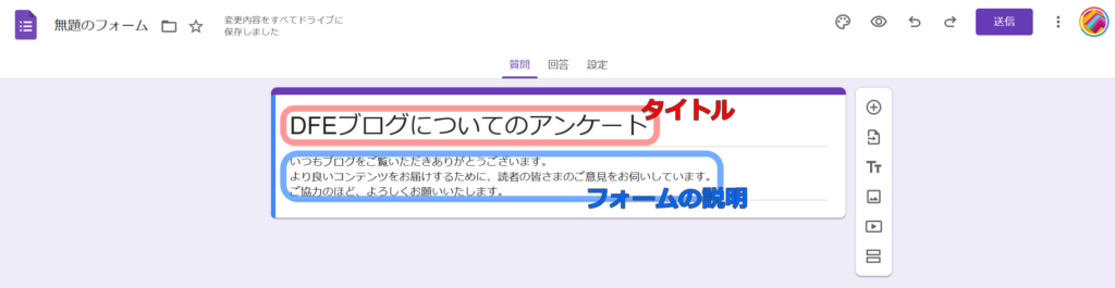 今回は「DFEブログについてのアンケート」というタイトルでアンケートを作成していきましょう。