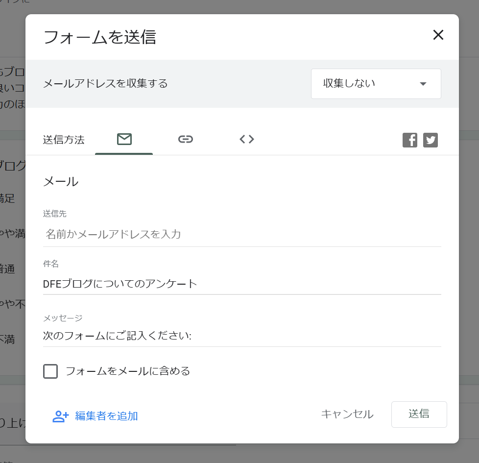 アンケートが完成したら、右上の「送信」ボタンをクリック。以下のような画面が出てくるので、リンクやメールで共有します。