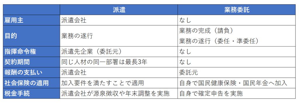 また報酬を支払う対象は、派遣は「作業時間」に対して、業務委託は「成果物」または「作業時間」に対してです。