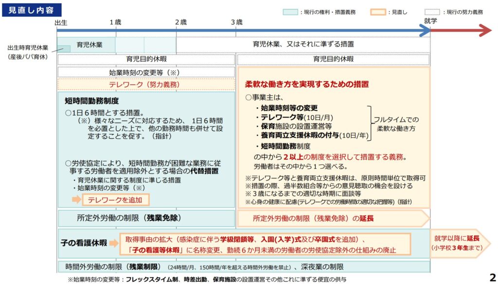 - 残業免除の対象拡大:小学校就学前の子を養育している親に対して、残業の免除措置が拡大