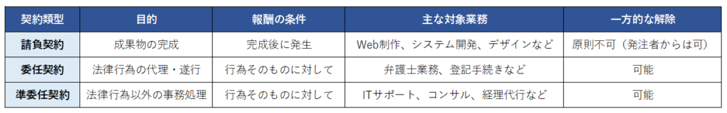 業務委託契約は、契約の種類によって「一方的に解除できるかどうか」が異なります。それぞれの契約形態ごとに見ていきましょう。