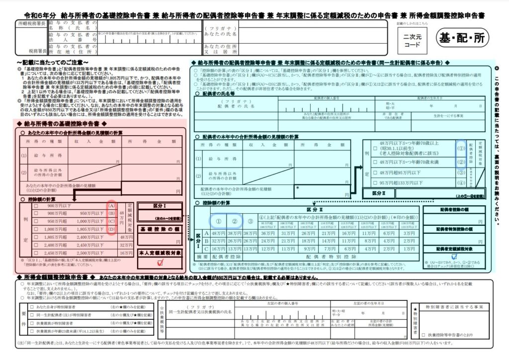 出典:国税庁「令和6年分 給与所得者の基礎控除申告書 兼 給与所得者の配偶者控除等申告書 兼 年末調整に係る定額減税のための申告書 兼 所得金額調整控除申告書」