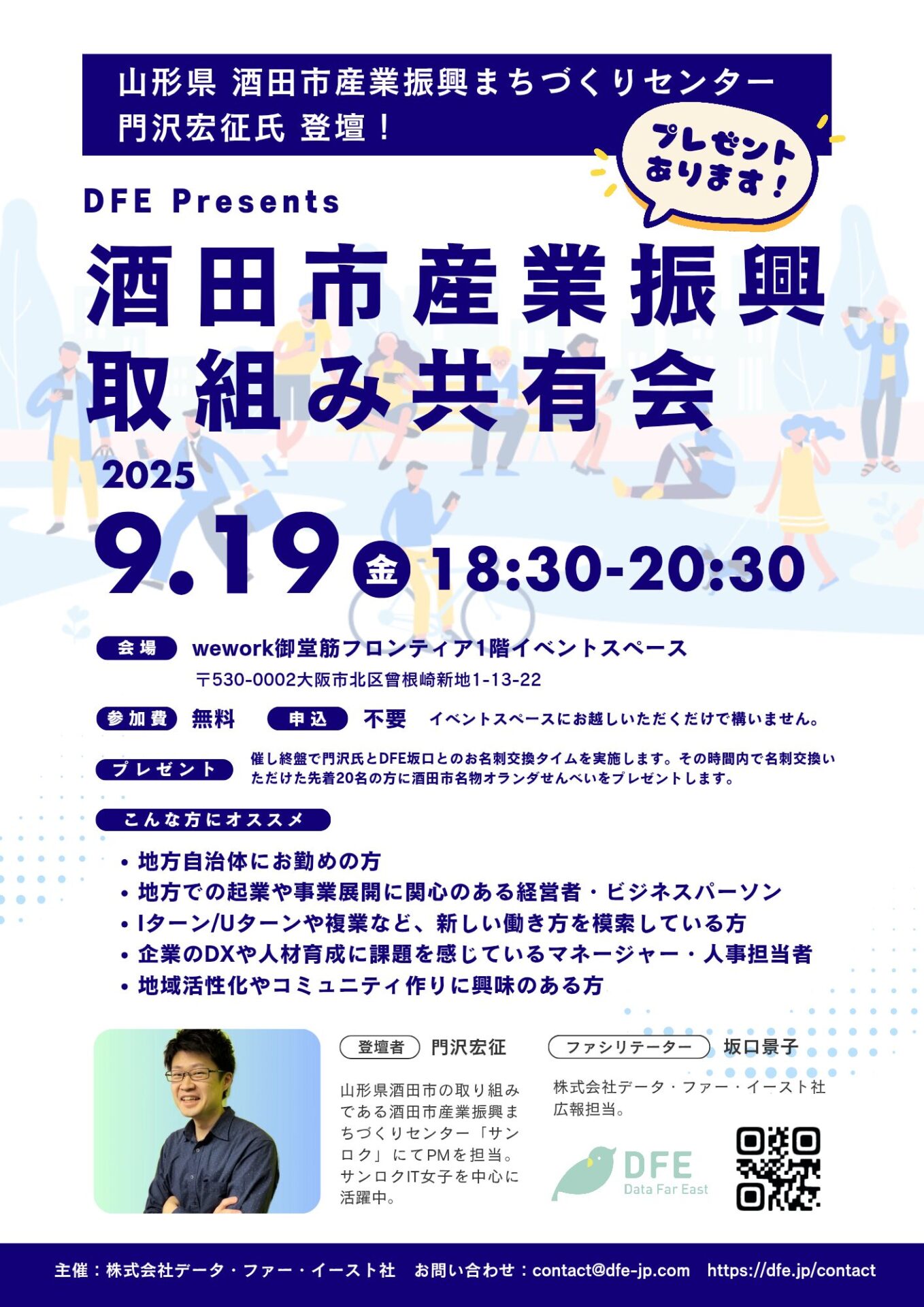 対談きっかけで弊社大阪本社にて酒田市産業振興まちづくりセンターサンロクの門沢 宏征さんのトークイベントが決まりました。 場所は弊社大阪本社のwework御堂筋フ...対談きっかけで弊社大阪本社にて酒田市産業振興まちづくりセンタ...